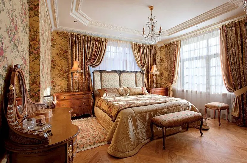 Отличительной особенностью таких спален являются большие кровати с тканевыми балдахинами на массивных, украшенных резьбой ножках. Проемы окон — высокие, но не широкие.