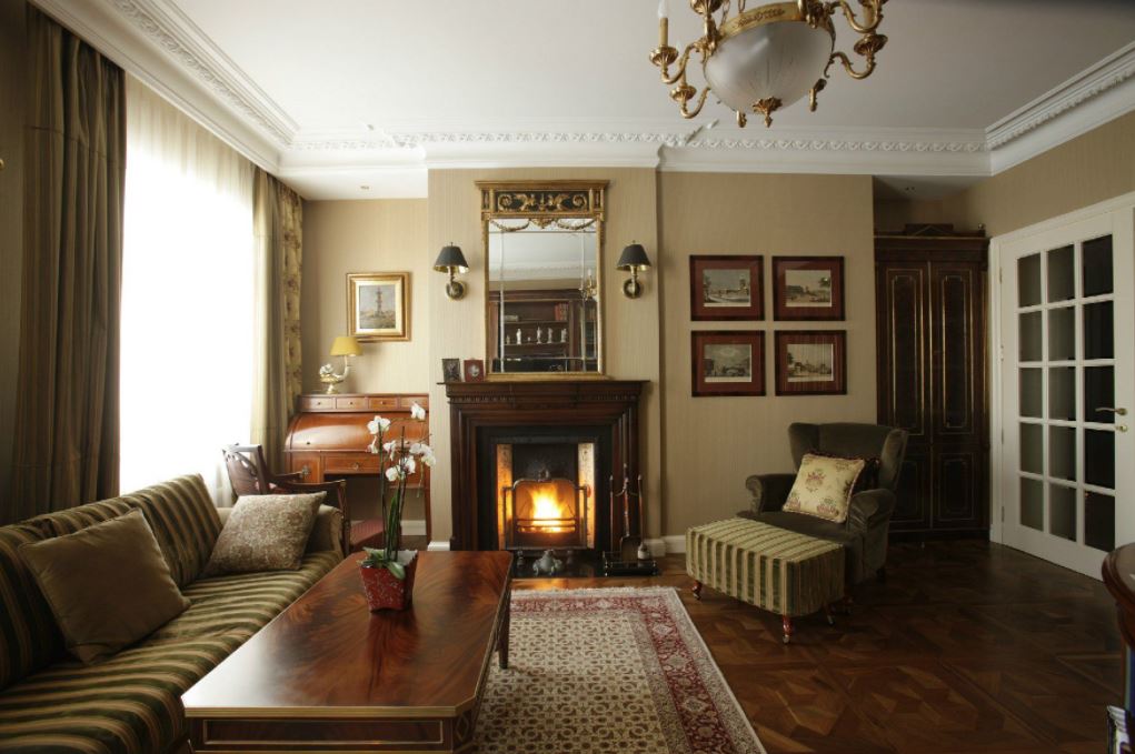 Мебель должна быть, если не дорогой, хотя бы иметь вид такой. Потому рекомендуется использовать предметы из дерева темных пород. Конечно, идеальным станет антиквариат или мебель под заказ, но позволить себе такие предметы могут далеко не все.