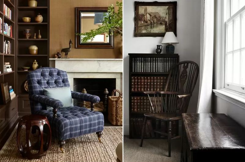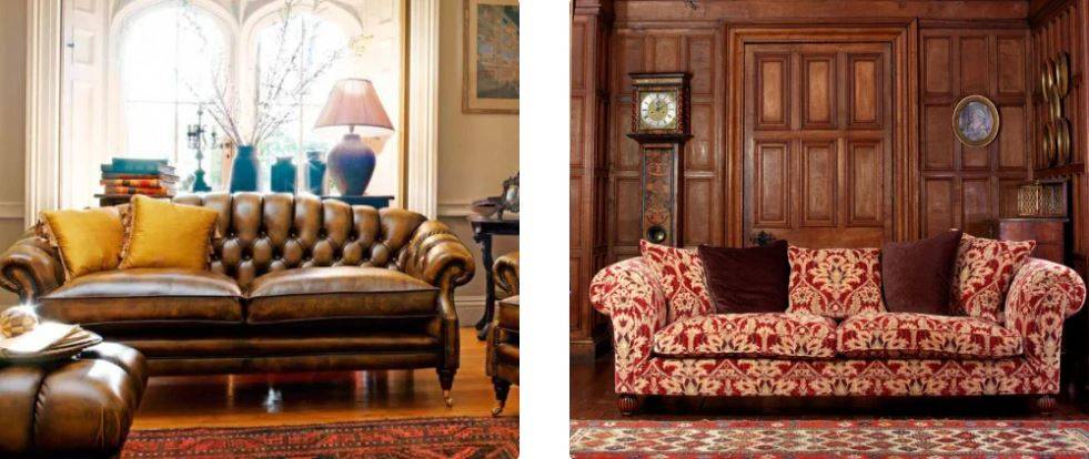 Идеально вписываются в интерьер в английском стиле шкафы, выполненные из темных пород дерева доверху забитые книгами. Очень популярен для данного интерьера низкий диван небольшого размера, обитый стеганым материалом и с овальными подлокотниками.