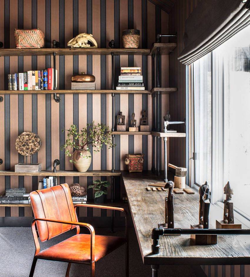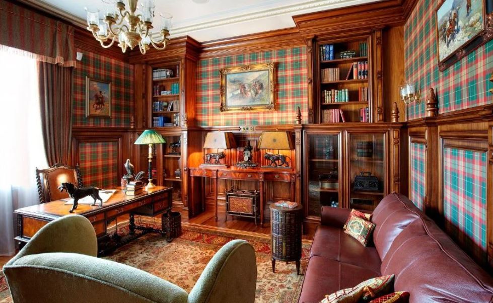 Любителям леса и охоты придутся по душе обои с изображением птиц и дичи. Кабинет в английском стиле можно оформить изделиями с элементами королевской тематики в виде гербов и корон. Также гармонично будут выглядеть в классическом мужском кабинете обои шотландская клетка. Полотна со строгой геометрией добавят помещению выразительности и брутальности.