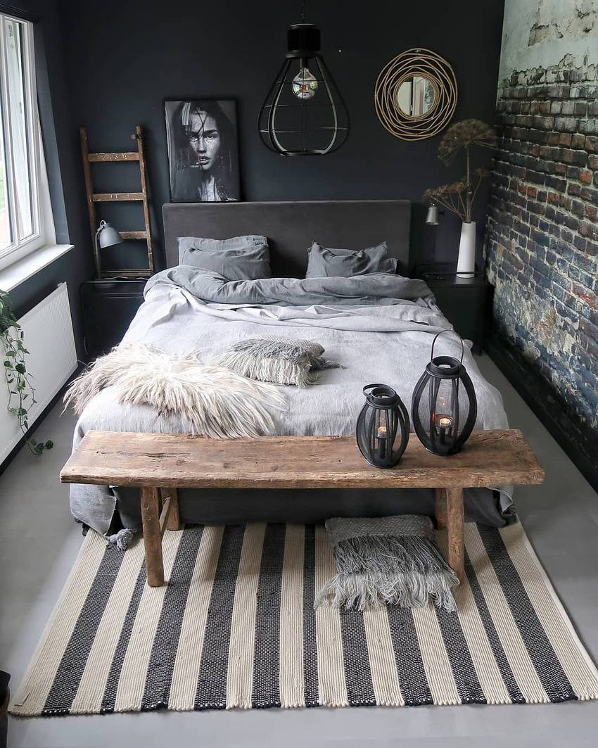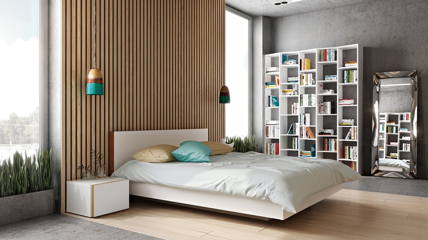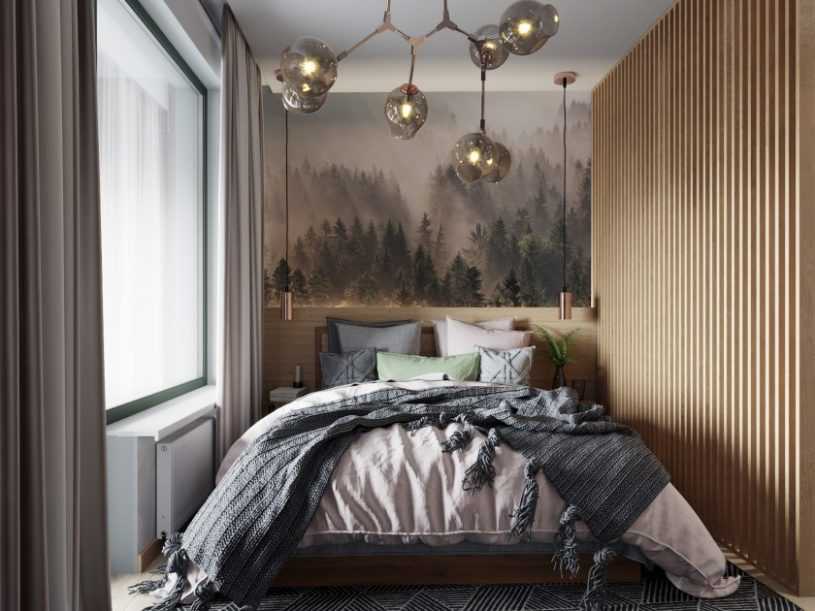 Отличным решением будет создание акцентной стены из ламината. Этот актуальный и модный тренд прекрасно впишется в интерьер спальни.
