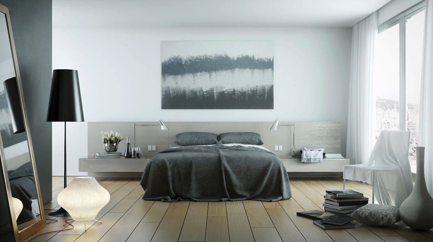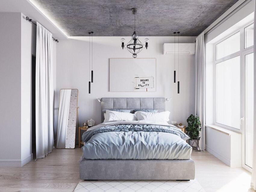 Очень часто белые цвета заменяются на голубые или серые оттенки. Первые придают комнате дополнительное очарование морозного ветра. Вторые наполняют спальню утонченной аурой.