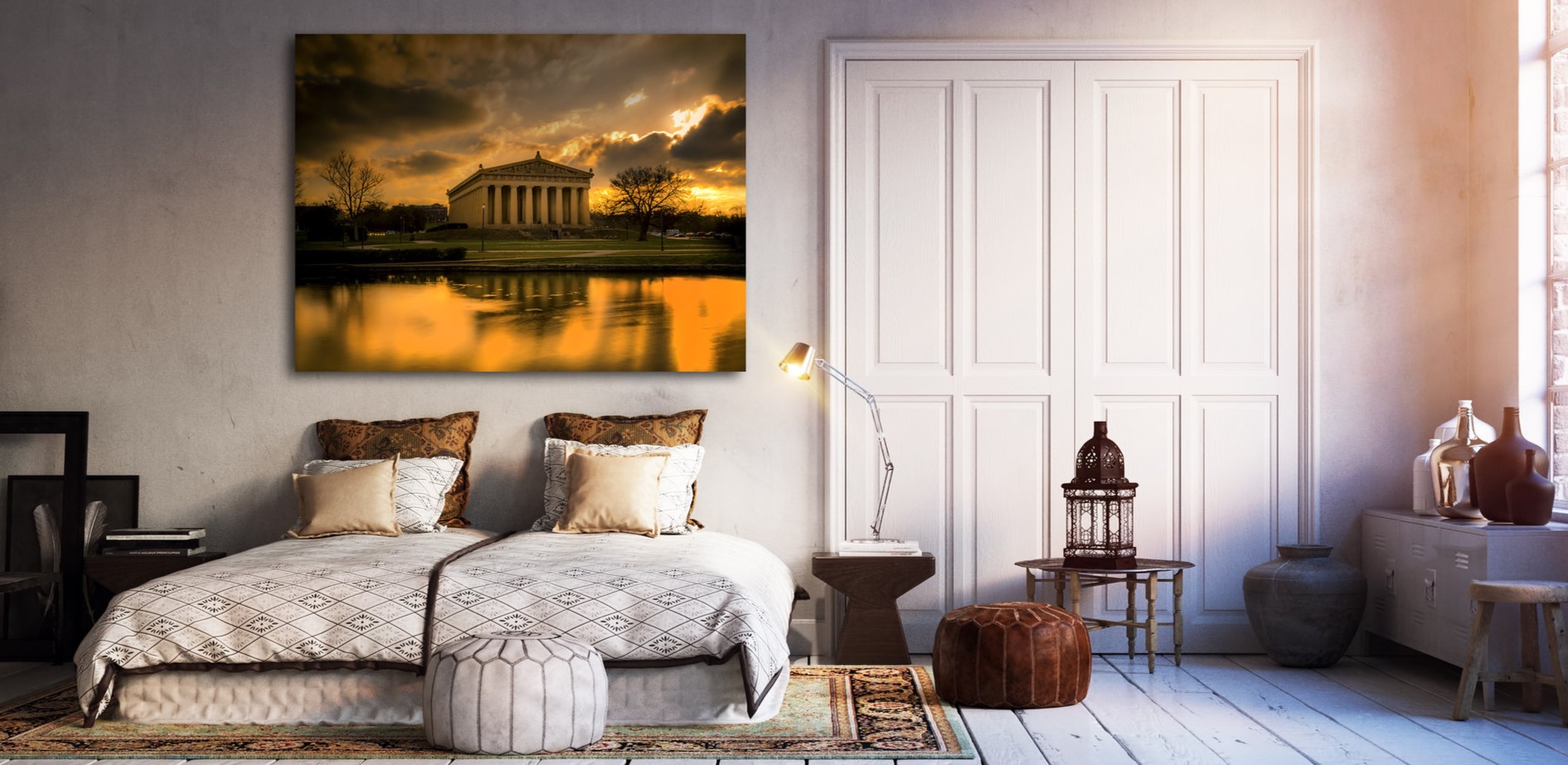 Скандинавские дизайнеры активно используют графический дизайн в оформлении. Яркие постеры, открытки и фотокартины украшают стены спальни.