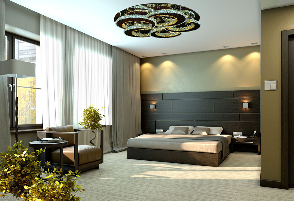 Все это можно сделать при помощи настенных бра, около кроватных ламп, торшеров. Яркость вполне может присутствовать, но она никак не должна слепить.