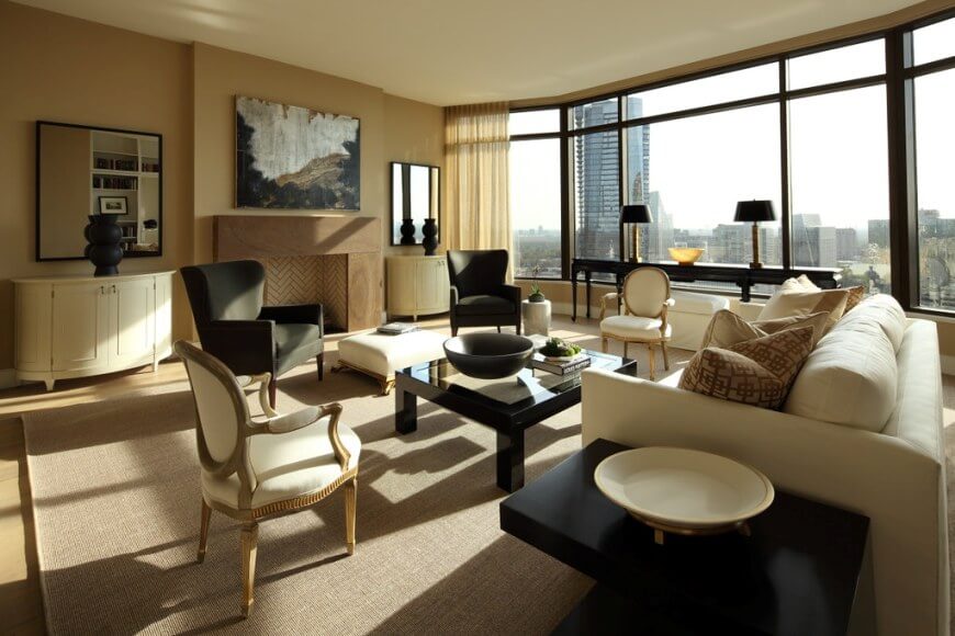 Черный в сочетании с гаммой беж в оформлении гостиной.