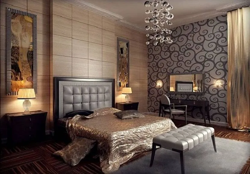 В такой спальне вы найдете много нарядной техники разной формы. Это и округлые сферы, и строгие трапеции, и замысловатые ступенчатые узоры. Активно используются бра и торшеры. Он даже разрешил классическую большую хрустальную люстру с коваными элементами или инкрустациями. Также в моде сталь, медь и стекло. Ниши, зеркала, картины и зону отдыха можно освещать отдельно. Таким образом создается зонированная и многоуровневая система освещения.