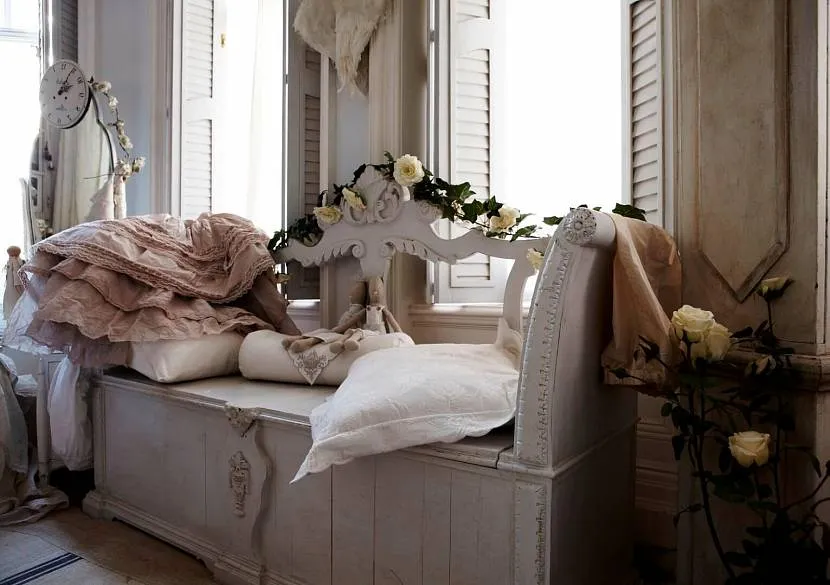 Если у вас есть возможность расположить в интерьере своей спальни действительно антикварные или просто настоящие старые вещи — это хорошо. Однако их всё равно придётся отдать дизайнеру, чтобы привести их в надлежащий вид. Я вот думаю, что по этому поводу не стоит так уж сильно заморачиваться. Для стиля shabby chic гораздо удобнее использовать специально изготовленные и искусственно состаренные вещи и предметы интерьера. Мебель покрывается разными слоями краски, которые потом зачищаются и специально обрабатываются, так что она выглядит ничем не хуже настоящего антиквариата, но при этом прочнее и удобнее.