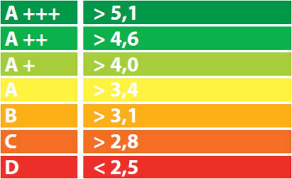 КПД кондиционера принято измерять в единицах, а не процентах. Она указана на внутренне модуле кондиционера, обозначена буквами от А+++ до D. Каждая единица соответствует 100% КПД. Мощность настенных сплит-систем может быть от 1,5 до 17,5 киловатт. Это соответствует охлаждению помещения площадью от 15 до 175 кв.м.