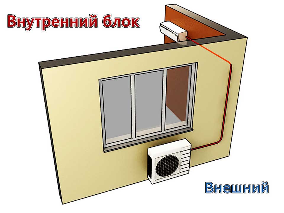 Сплит-системы состоят из двух блоков, один из которых располагают внутри помещения, а второй – снаружи. Блоки соединены трубками с хладагентом, электрическими кабелями и кабелями управления. Наружный воздух в помещение сплит-системы не подают.
