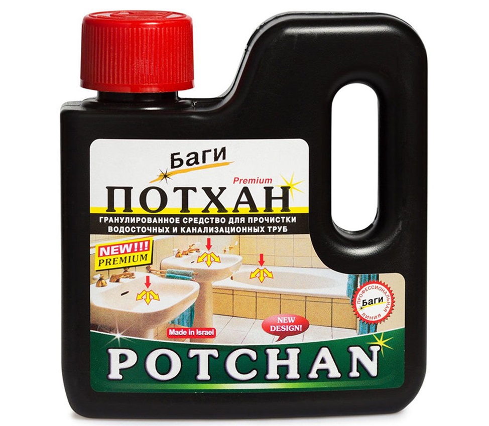 Потхан – гранулированное очень экономичное вещество для устранения засоров. Абсолютно безопасно как для пластиковых, так и металлических труб. Качественно растворяет кусочки пищи, известковый налет, волосы, бумагу. Производится в Израиле.