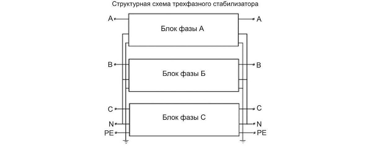 Трехфазные стабилизаторы отличаются от однофазных лишь количеством линий стабилизации.