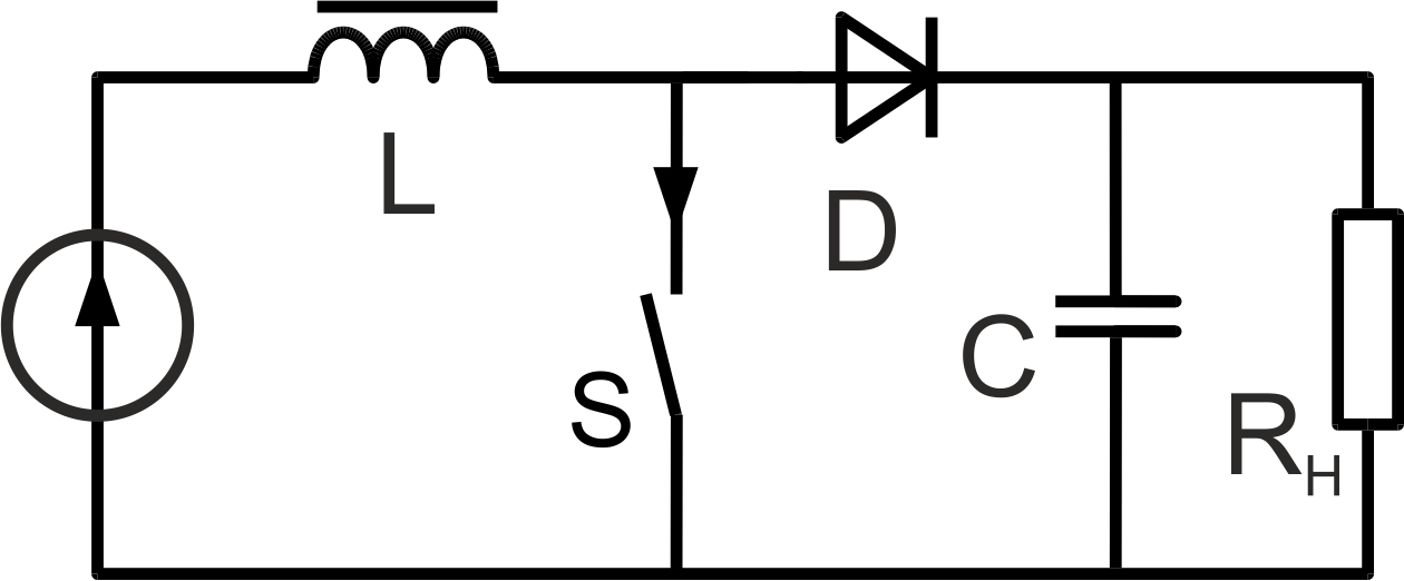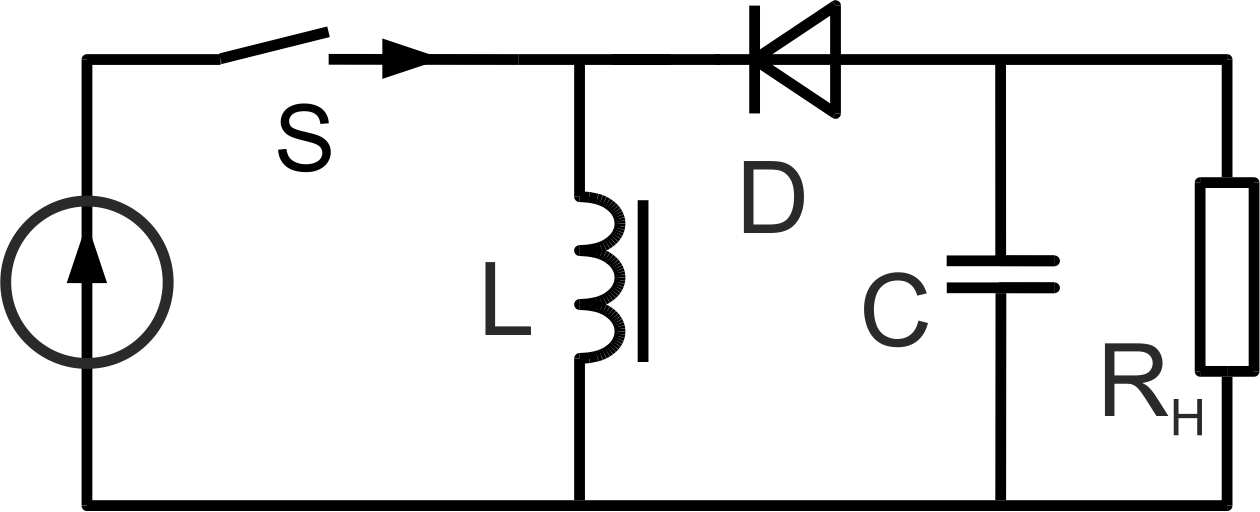Схема импульсного стабилизатора, приведённая ниже, также работает на основе дросселя, однако дроссель всегда подключен к выходу источника питания. Когда ключ разомкнут, питание поступает через дроссель и диод на нагрузку. Когда ключ замыкается, дроссель накапливает энергию, когда ключ размыкается, возникающее на его выводах ЭДС добавляется к ЭДС источника питания и напряжение на нагрузке возрастает.