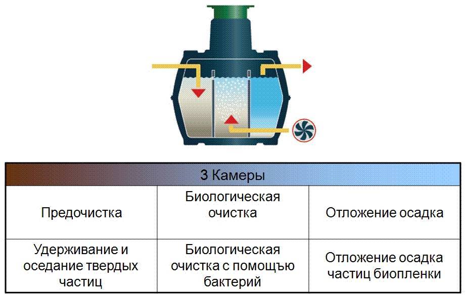 Станция глубокой биологической очистки работает с использованием продуктов жизнедеятельности микроорганизмов, которые есть в стоках. В устройстве создаются специальные условия, при которых микробы смогут существовать. Туда закачивается воздух, с использованием которого бактерии разлагают отходы. В камерах находятся анаэробые и аэробные микроорганизмы, которые поглощают попадающие в жидкость вредные вещества и перерабатывают их в процессе своей жизнедеятельности.