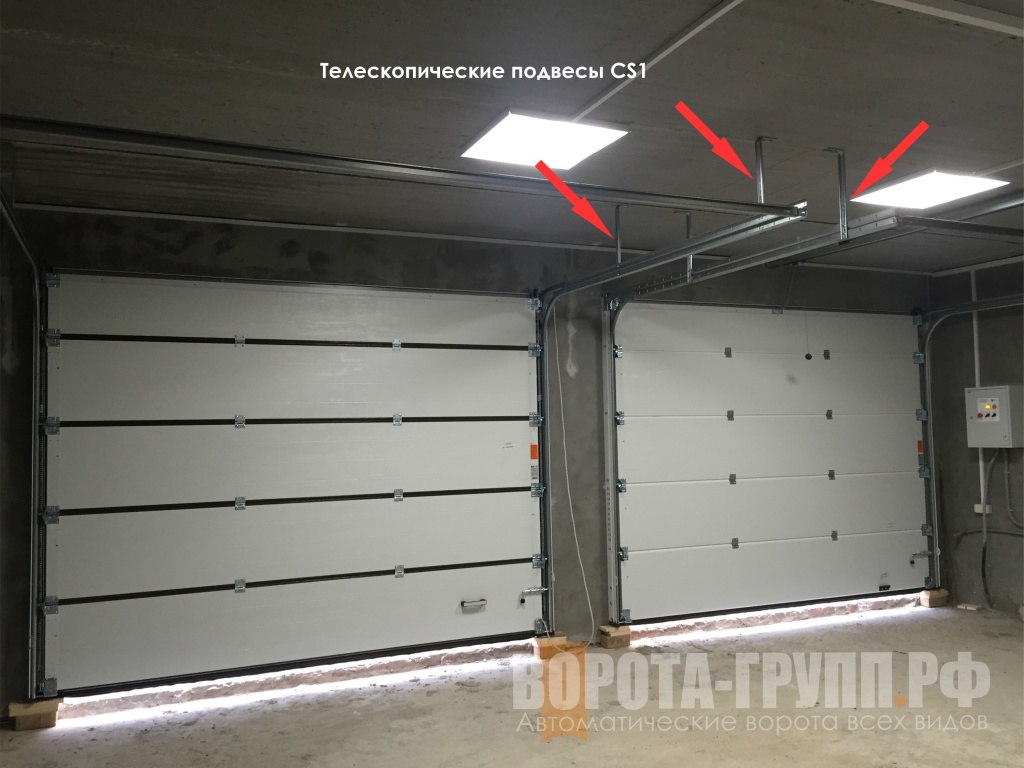 Ворота висят под потолком не абы как, а на специальных телескопических подвесах. Они бывают разной длины. По умолчанию в комплекте идут CS1, длиной 300мм. Если у вас притолока (теперь вы знаете что это такое) до 300мм, то все ОК. Если больше, то берем другой размер. Их всего 5, на 500, 800, 1000, и 1500мм. Иногда вешают на монтажный уголок, тоже вариант, но незабываем делать трапецию для жесткости, и не делать их слишком длинными (более 1500мм), конструкция будет неустойчивая.