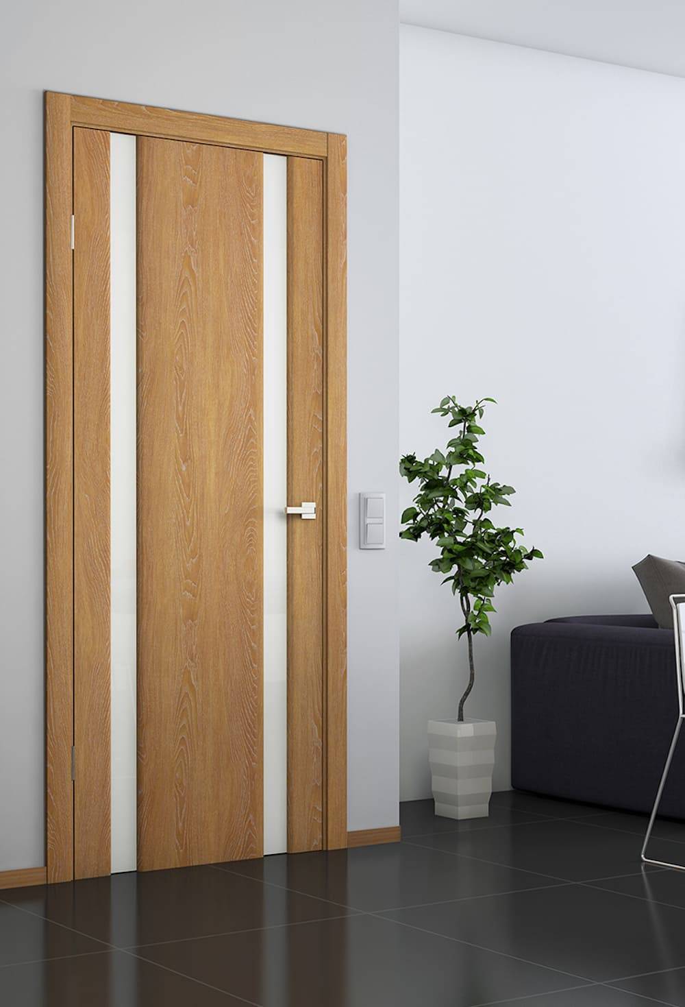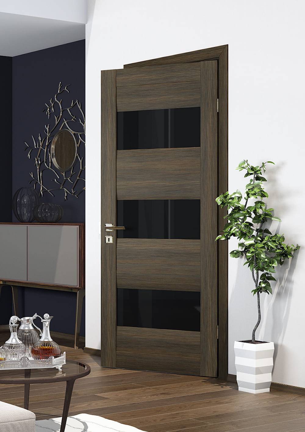 Если цвет меблировки смежных комнат отличается, то отличным решением проблемы будет монтаж шпонированных межкомнатных моделей. Стороны дверей, выходящие в коридор или холл, оформляют одним цветом. А для других сторон подбирают индивидуальное цветовое оформление. Стеклянные вставки при этом сыграют роль объединяющего элемента.