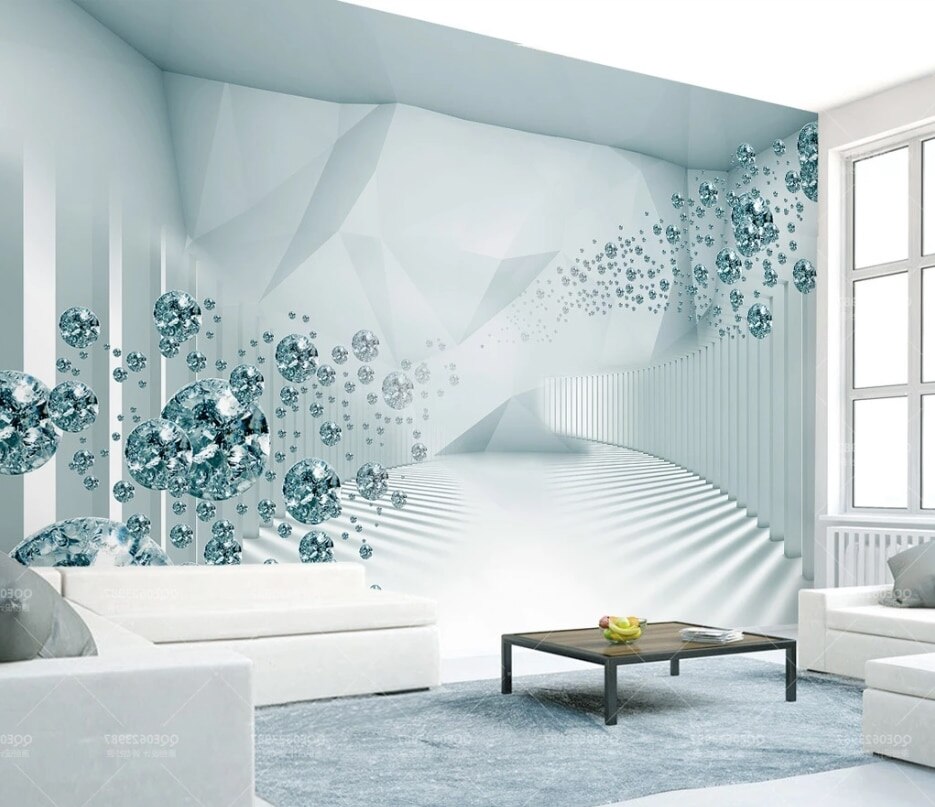 Стереоскопические обои с геометрией чаще всего используются в сочетании с однотонными покрытиями, иначе интерьер комнаты рискует стать слишком перегруженным. Лучшим вариантом будет полная отделка одной из стен.