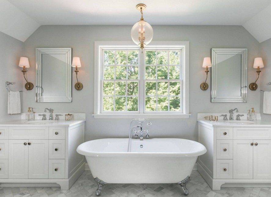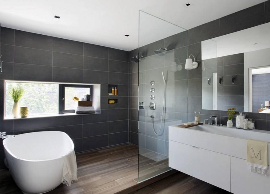Комбинацией разных по яркости тонов в разных пропорциях можно реализовать ванную комнату любого современного стиля: