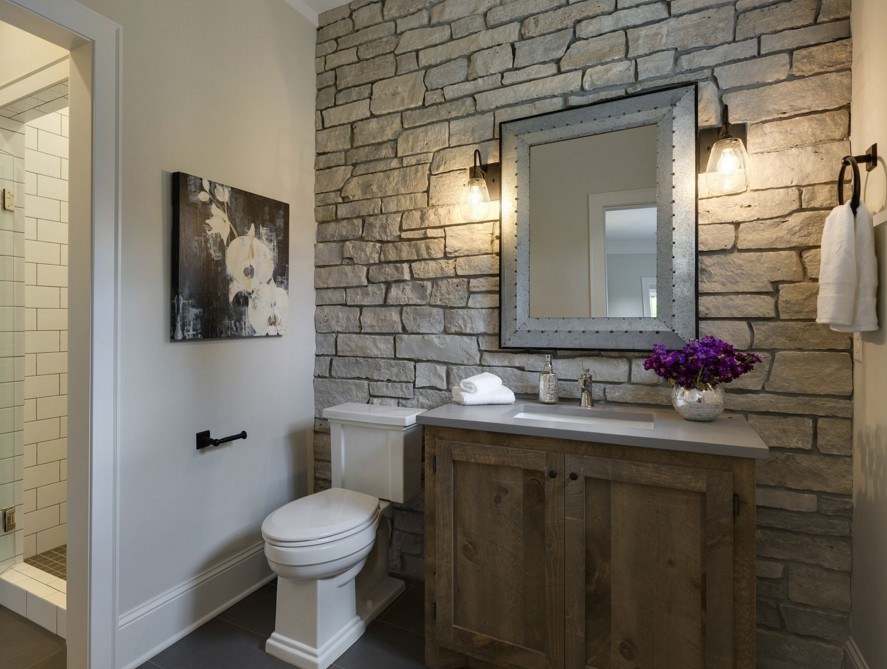 - Идеальный вариант покрытия пола – мелкая кафельная плитка для ванной комнаты, которая имитирует кирпич или камень