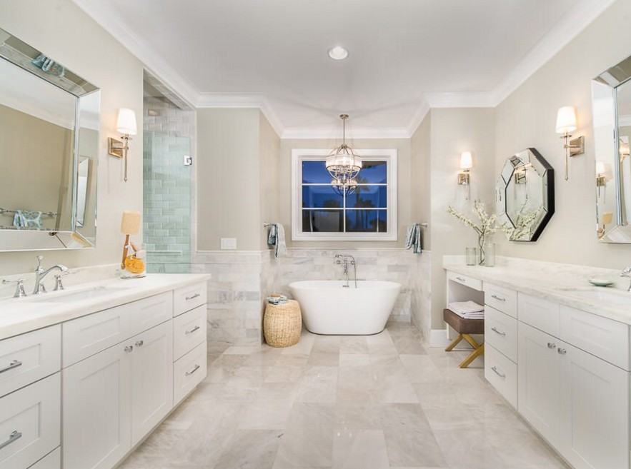 - Мрамор, отдельностоящая ванна и дорогой декор — арт-деко.
