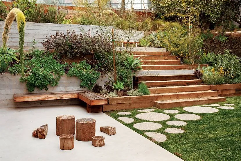 - Извилистые дорожки, изготовленные из натуральных материалов спила дерева, камня.
