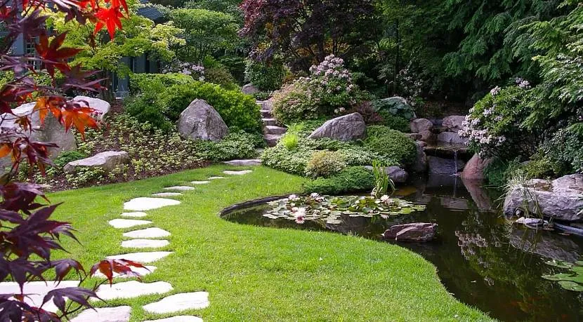 - Плавные утонченные линии. Никаких резких перепадов в оформлении кустарников и декоративных цветущих многолетников. Приветствуются мягкие формы: извилистые тропинки, ассиметричные берега водоемов.