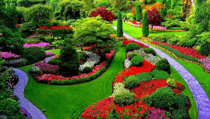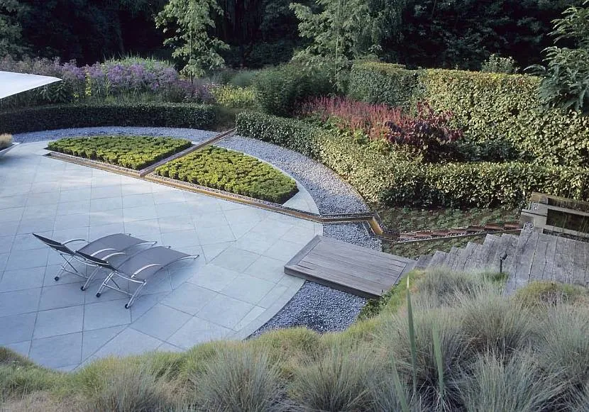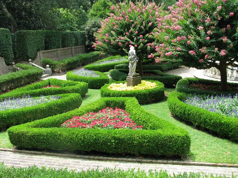 - Строгая симметрия. Это прослеживается в декоративной растительности: аккуратно и одинаково подстриженные кустарники, одной высоты цветы, ровные формы цветников и альпинариев.