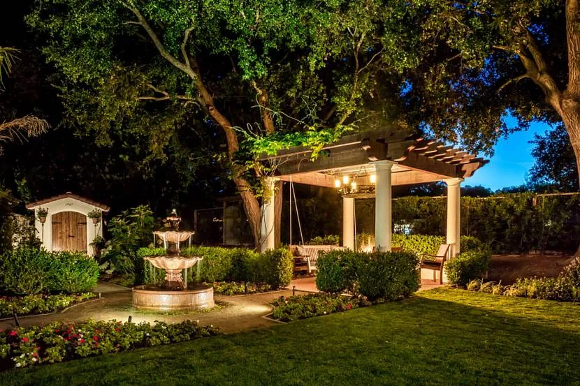 Если на дереве расположить прожектор неровного свечения, то вся территория будет освещена легким рассеянным лунным светом. Водоемы на участке также требуют освещения и их подсвечивание должно гармонично связано с остальным освещением территории. Любые коммуникации должны быть надежно скрыты согласно проекту, которые можно удобно проложить, но и красиво вписать в декор участка.