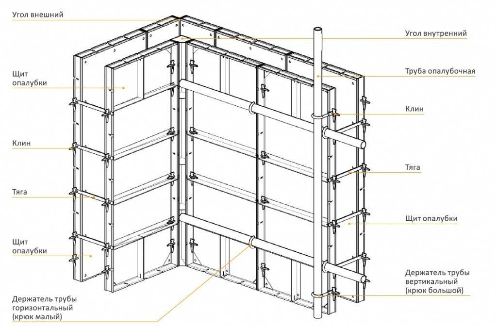 Блочно-щитовая вертикальная опалубка имеет несколько модификаций, которые получили широкое распространение при заливке вертикальных объектов, расположенных внутри помещений. В зависимости от технологических особенностей элементы комплекса могут изменяться, но имеются универсальные компоненты, присутствующие в каждой из существующих вариаций данной системы. К таковым можно отнести: