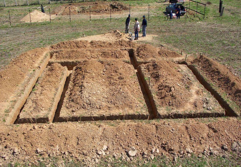После разметки участка начинают выполнять основные работы по закладке основания дома. Ленточный фундамент на буронабивных сваях прослужит более 70 лет, при условии выполнения всех этапов технологического процесса.