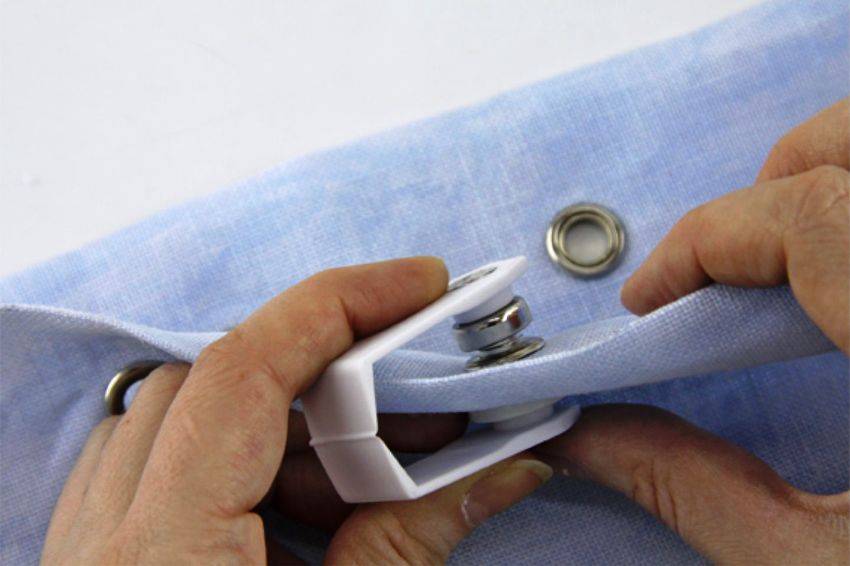 Когда предварительные работы завершены, приступают непосредственно к креплению. Для этого люверсы тщательно промываются и очищаются от пыли, металлические кольца дополнительно можно отполировать. Затем полотно разворачивается изнаночной стороной, а под нее кладется лицевая часть кольца, которую сверху придавливают второй половинкой. Люверс считается надежно закрепленным, если после надавливания послышится характерный для защелкивания звук. После этого нужно проверить, чтобы на ткани вокруг кольца отсутствовали загибы. В противном случае половинки следует разделить и повторить процесс защелкивания. Точно так же монтируются и остальные кольца.