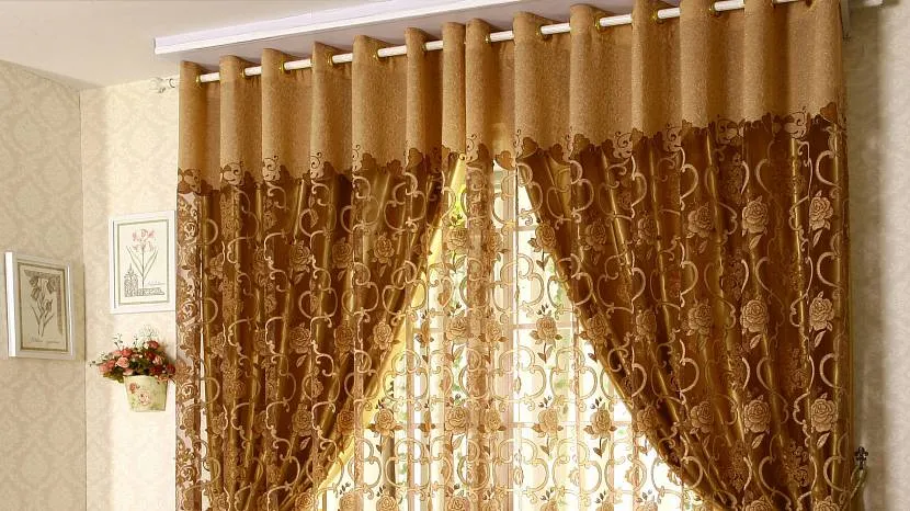 Тюль золотистого цвета с люверсами для кухниИсточник dibaj-decor.sa