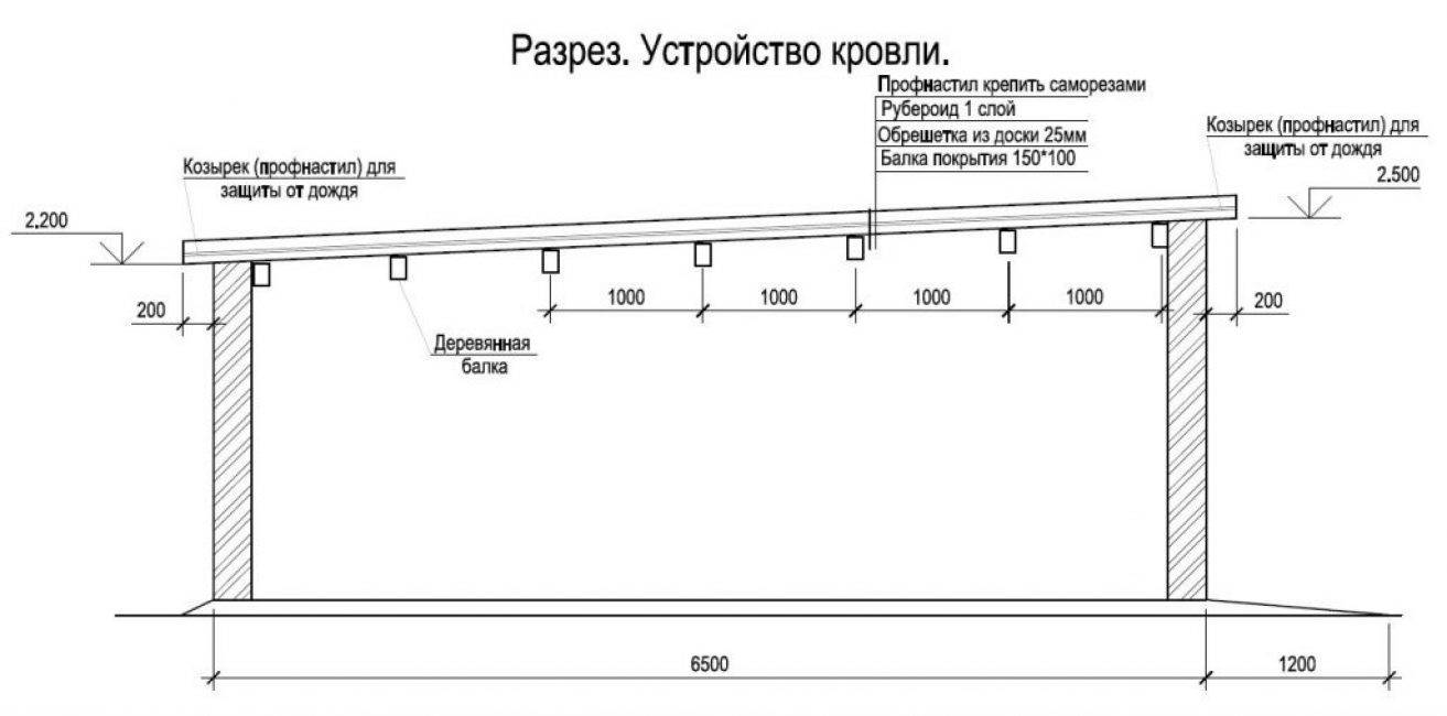 Моет быть как односкатной, так и двускатной, зависит от особенностей отвода осадков на данной местности и рельефа поверхности. Первоначально устанавливается гидроизоляция, затем возводятся стропила, на которые крепится профнастил или рубероид.