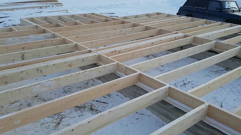 На обвязку устанавливается доска 20х5 см на ребро. Она также выравнивается по внешнему краю фундамента и крепится саморезами. Лаги монтируются из досок такого же сечения. Крепятся саморезами или специальными уголками. Шаг установки – 30–60 см.