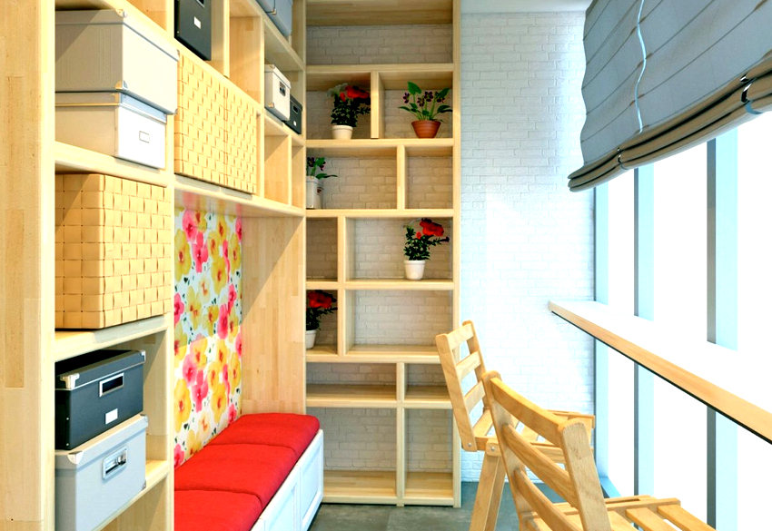 Место на лоджии в форме сапожка можно использовать под кладовку или шкаф с полками