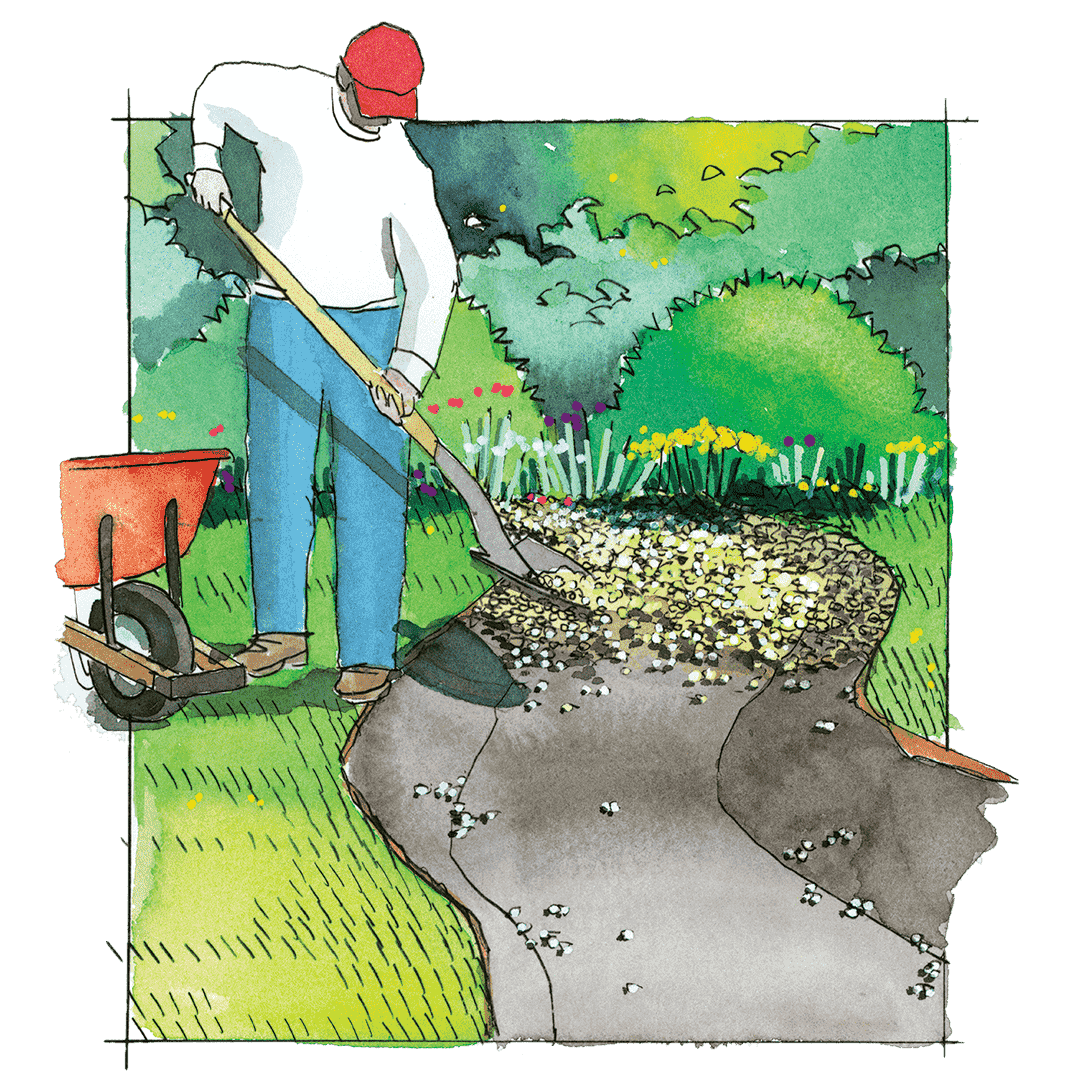 Для этого осторожно «расчесывают» граблями по самой поверхности. Нижние слоя песка и земля остаются невредимыми. Для создания контуров будущего ручья выкапывают неглубокую траншею, словно для пешеходной тропинки, не более 20 см в глубину