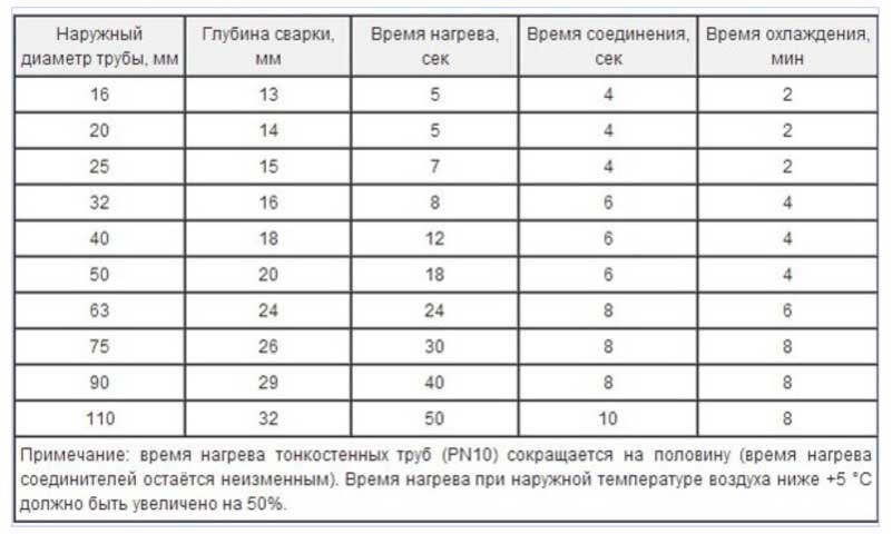 Чтобы знать, как правильно сваривать полипропиленовые трубы, необходимо учитывать время нагрева. Правильный период позволит деталям разогреться до необходимой температуры и при этом не расплавиться. Он зависит от диаметра трубы.