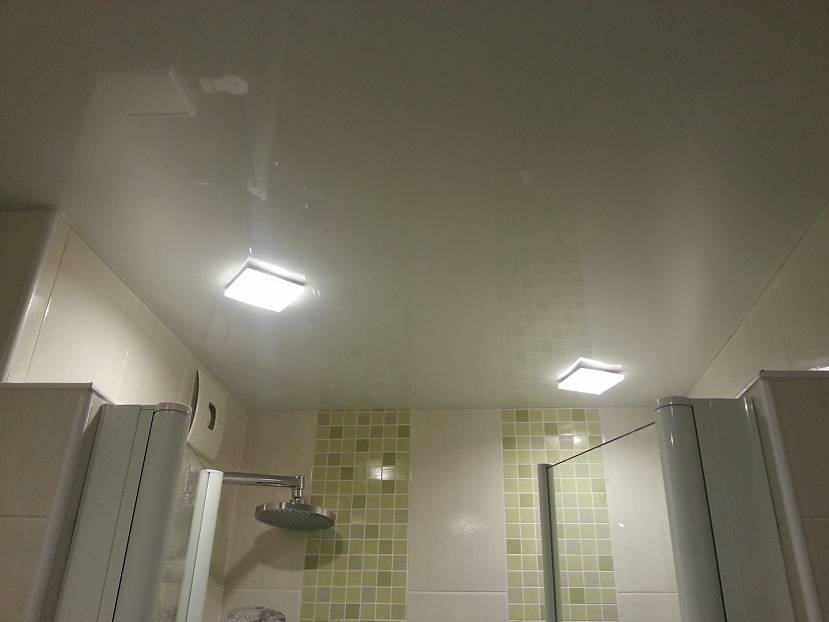 При организации потолочного освещения применяются лампы накладного или встроенного способа крепления. Размер светильника и количество источников выбирают, отталкиваясь от площади комнаты. Дополнить просторное помещение с высокими потолками можно большой красивой люстрой. Стеклянные или хрустальные плафоны устанавливаются на удалении от потолочной ПВХ-пленки. Компактным ванным комнатам не стоит устанавливать большие потолочные люстры. Они отнимают свободное пространство, не позволяют визуализировать стиль оформления ПВХ-пленкой.