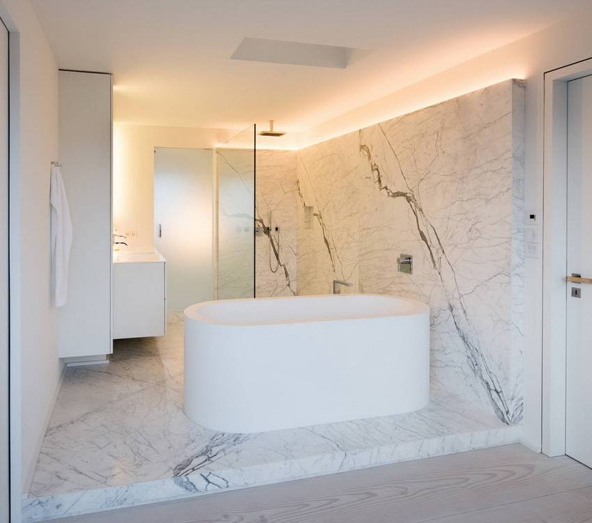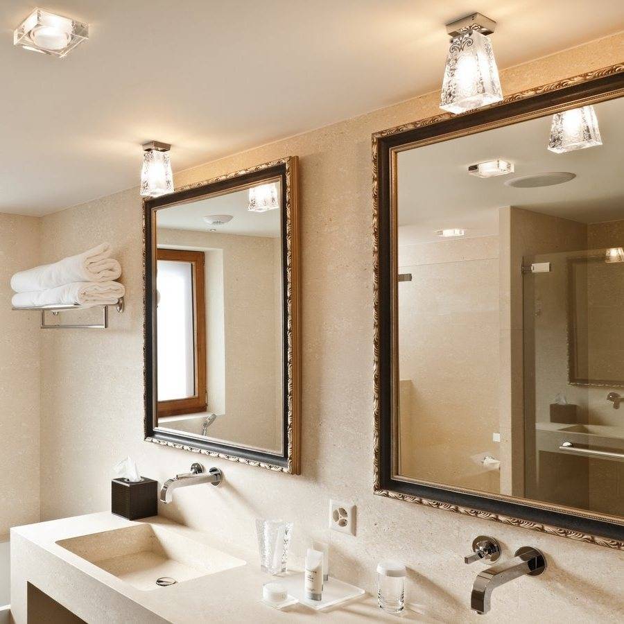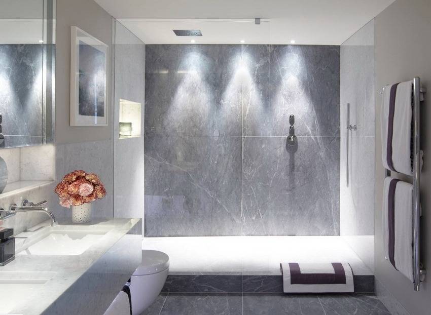 Общий свет часто создают, комбинируя потолочные и точечные модели. Например, красивую люстру с низким уровнем защиты от влаги устанавливают в стороне, а зону душа или ванной освещают встраиваемыми моделями.