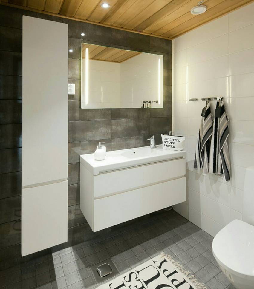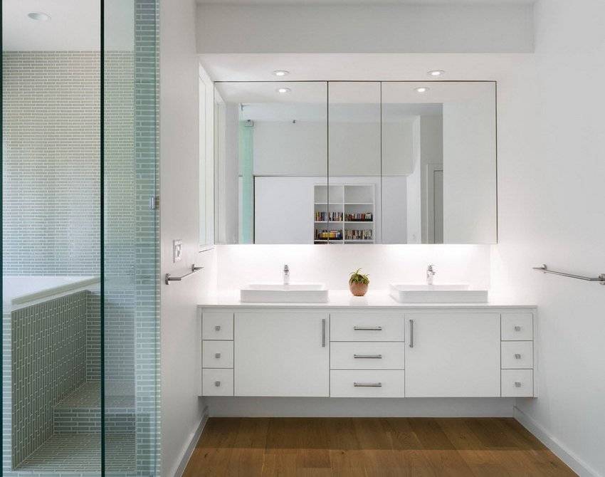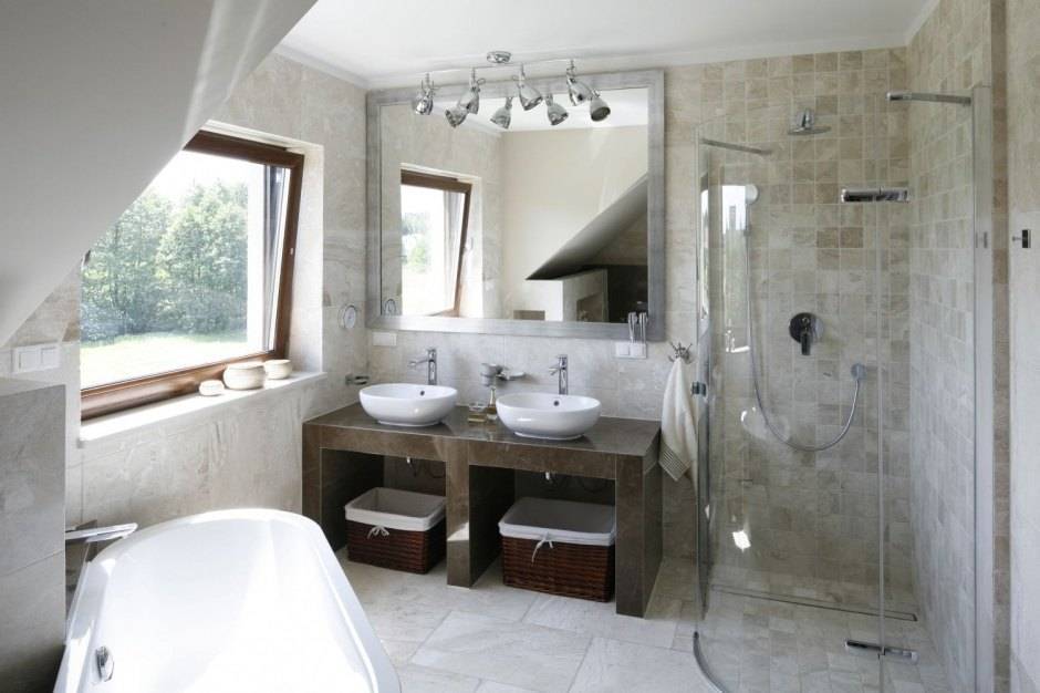 В зависимости от размера помещения будет изменяться количество необходимых светильников. Так, при площади ванной комнаты в 4,5 кв.м. достаточно было бы одного потолочного светильника на 2 лампы накаливания (мощность 60 Вт), однако дополнительный свет возле зеркала сделает бритье и нанесение макияжа более комфортным. Для просторных ванных необходимо наполнить светом каждую функциональную зону отдельно.