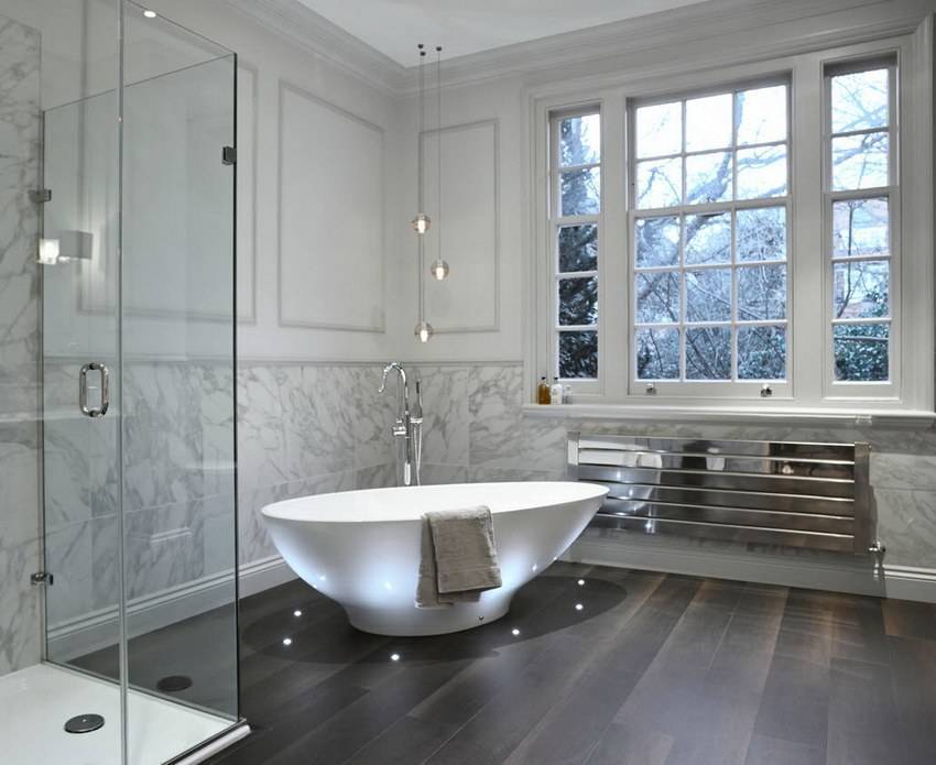 Немного менее популярны светодиодные светильники для ванны. Они являются вполне себе современным элементом, и отлично подходят как для ванны в стиле модерн, так и для более классических вариантов. Светодиодные светильники отличаются от своих собратьев массой преимуществ, однако, стоимость их гораздо выше. Да, в этом случае за качество приходиться платить, но зато, светодиодные светильники перегорают не так часто, как обычные лампы накала, и к тому же помогают вам экономить электричество.