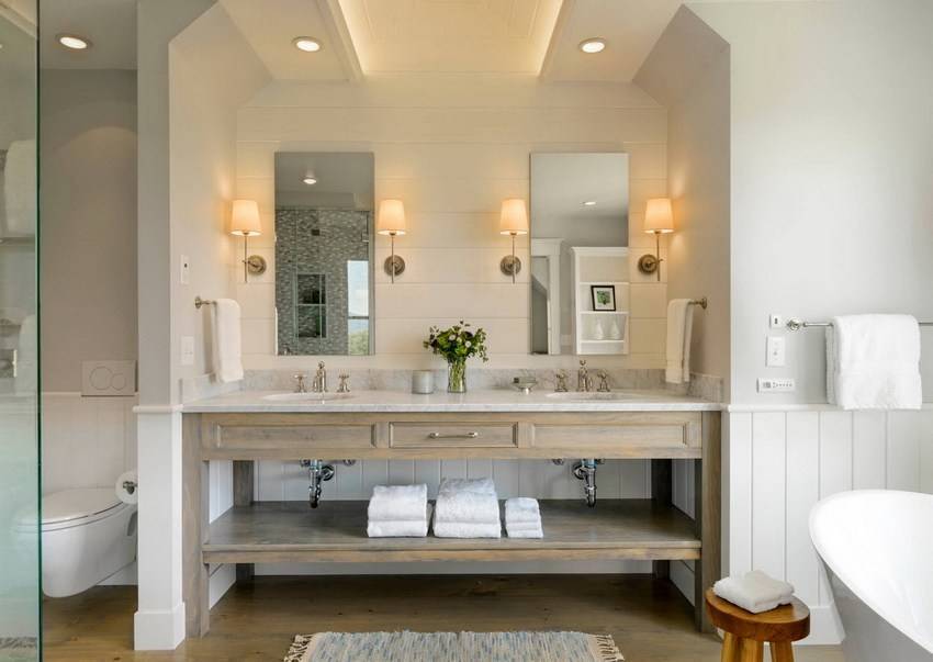 Чтобы с комфортом умываться, принимать душ, делать макияж, стирать и отдыхать, нужно минимум два типа освещения — общее и рабочее. Это касается даже комнат площадью в несколько квадратных метров. А если помещение просторное, стоит задуматься о декоративном и другом дополнительном свете.
