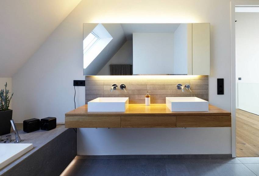 - Дополнительное освещение. Чаще всего размещают над умывальником. Наиболее удобно использовать зеркало с подсветкой сверху или по бокам.