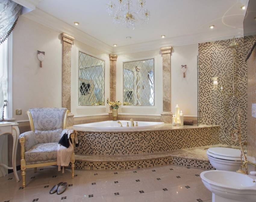 Хрусталь для таких комнат – демонстрация роскоши, поэтому данные светильники украшают просторные ванные, нередко представляющие собой большие помещения, совмещающие ванную и туалетную комнату.