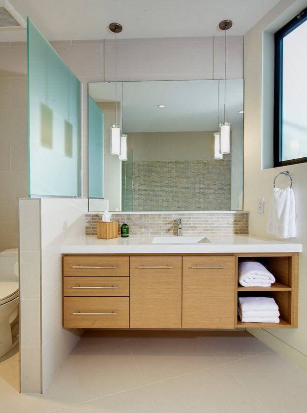 В зависимости от размера помещения будет изменяться количество необходимых светильников. Так, при площади ванной комнаты в 4,5 кв.м. достаточно было бы одного потолочного светильника на 2 лампы накаливания (мощность 60 Вт), однако дополнительный свет возле зеркала сделает бритье и нанесение макияжа более комфортным. Для просторных ванных необходимо наполнить светом каждую функциональную зону отдельно.