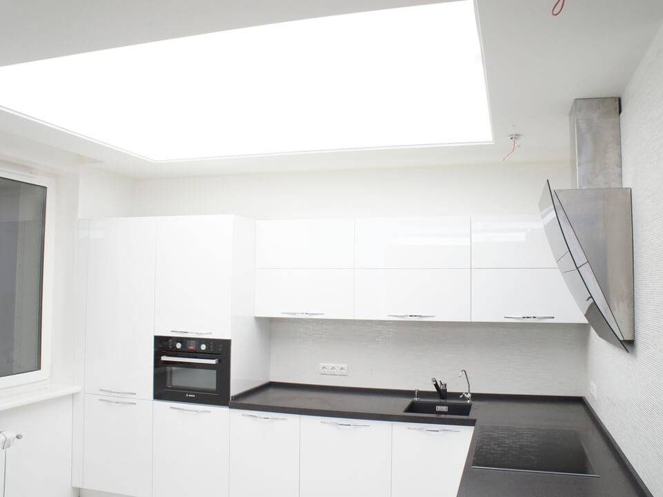 Натяжной потолок на кухне является не только элементом декора, но средством для удержания потока воды. При возникновении протечек пленка способна выдерживать нагрузку до 100 килограмм.
