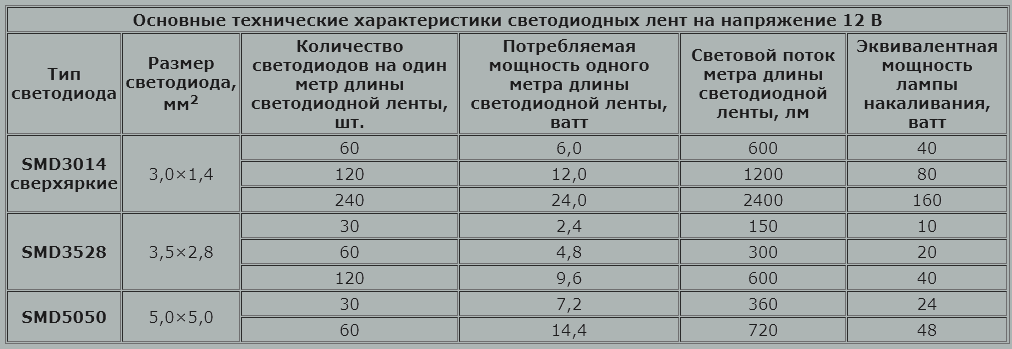 Мощность LED-светильника в свою очередь зависит от плотности расположения чипов и интенсивности выдаваемого ними светового потока. Например, SMD-лента 3528, имеющая 60 диодов на 1 м, потребляет 4,8 Вт, а 5050 при той же плотности – уже 15 Вт.