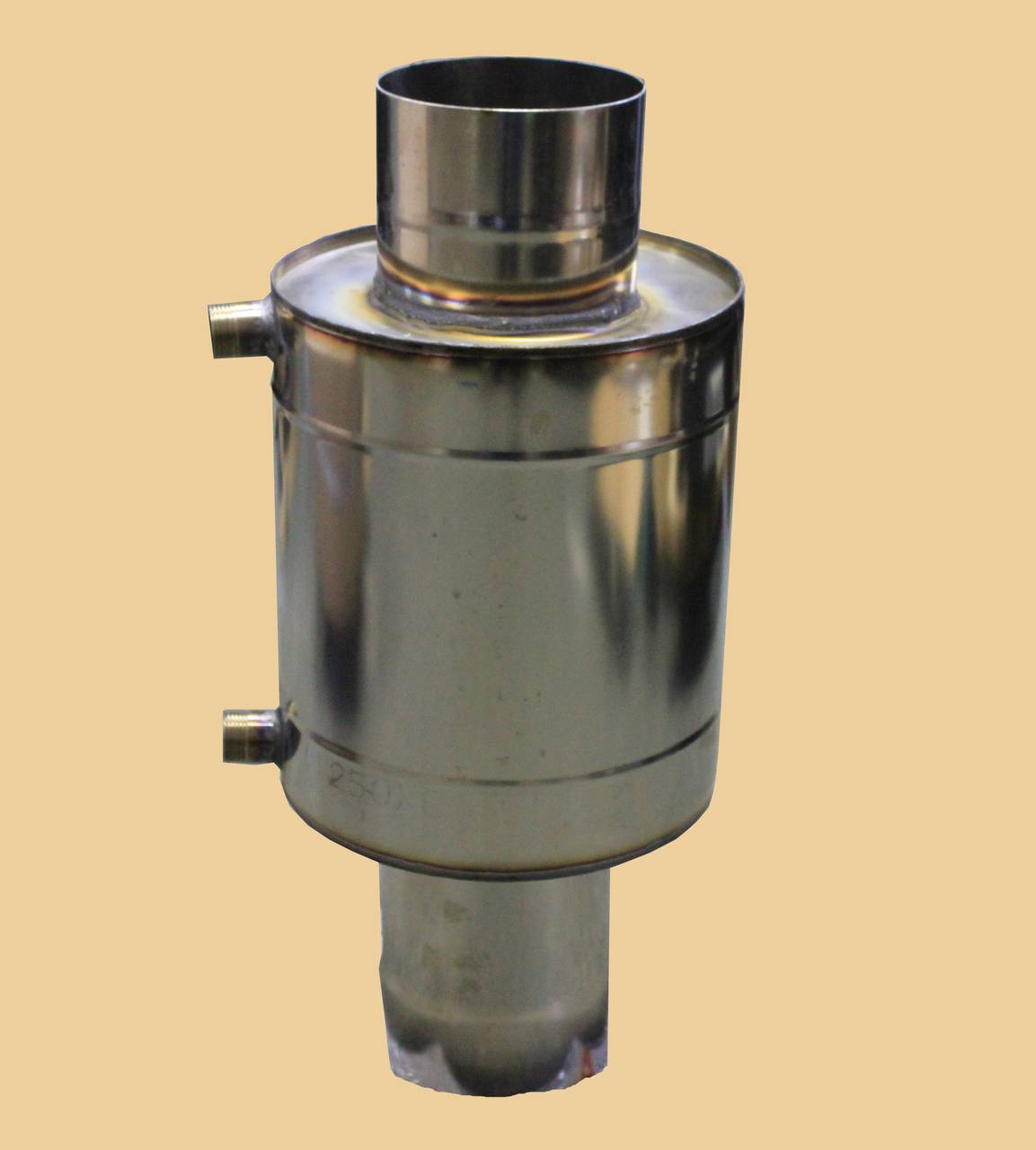 - Водяная «рубашка». Это своеобразный цилиндр, который надевается на трубу и заполняется водой. Запомните важный нюанс, не стоит делать одну общую зону для заполнения, лучше провести через цилиндр несколько меньших по диаметру каналов.