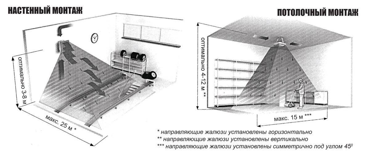 При монтаже тепловентилятора на стену расстояние от него до поверхности не может быть менее 0,4 м. При этом высота расположения прибора не должна превышать 8 м.