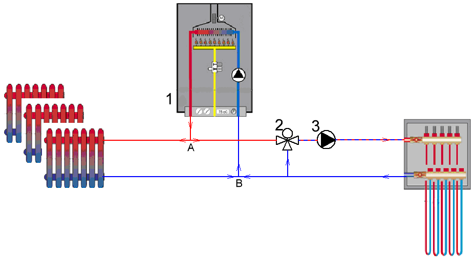 - В ситуациях, когда работают и радиаторы, и теплый пол, насос теплых полов 3 при определенных положениях смесительного клапана 2 снижает перепад давления между точками A и B и тем самым снижает циркуляцию теплоносителя через контур радиаторов.