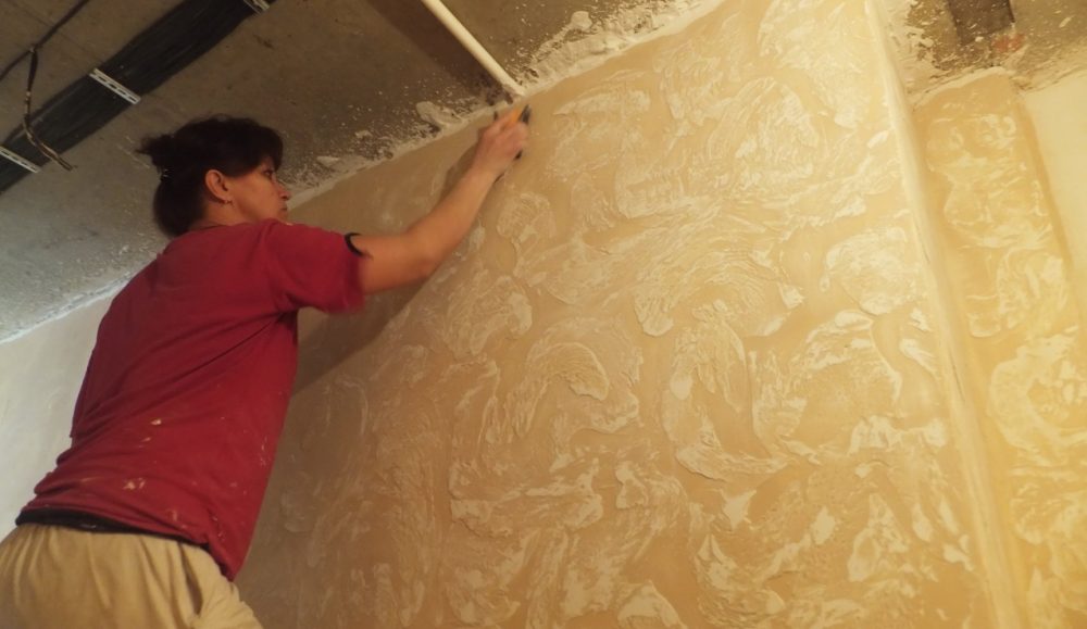 Штукатурка стен своими руками происходит с использованием специальной терки. Инструмент располагается под углом, и смесь размазывается по всей площади стены. Толщина слоя напрямую зависит от показателя зернистости облицовки. После покрытия всей стены на поверхности потребуется сформировать орнамент. При желании для нанесения можно использовать распылитель, но стоимость такого инструмента довольно высокая.
